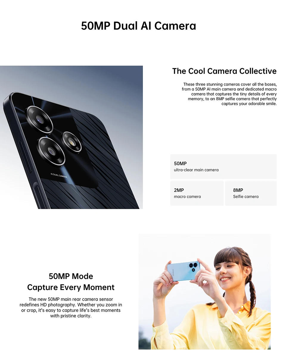 Camera ——- 50MP Dual AI Camera+2MP Macro Camera